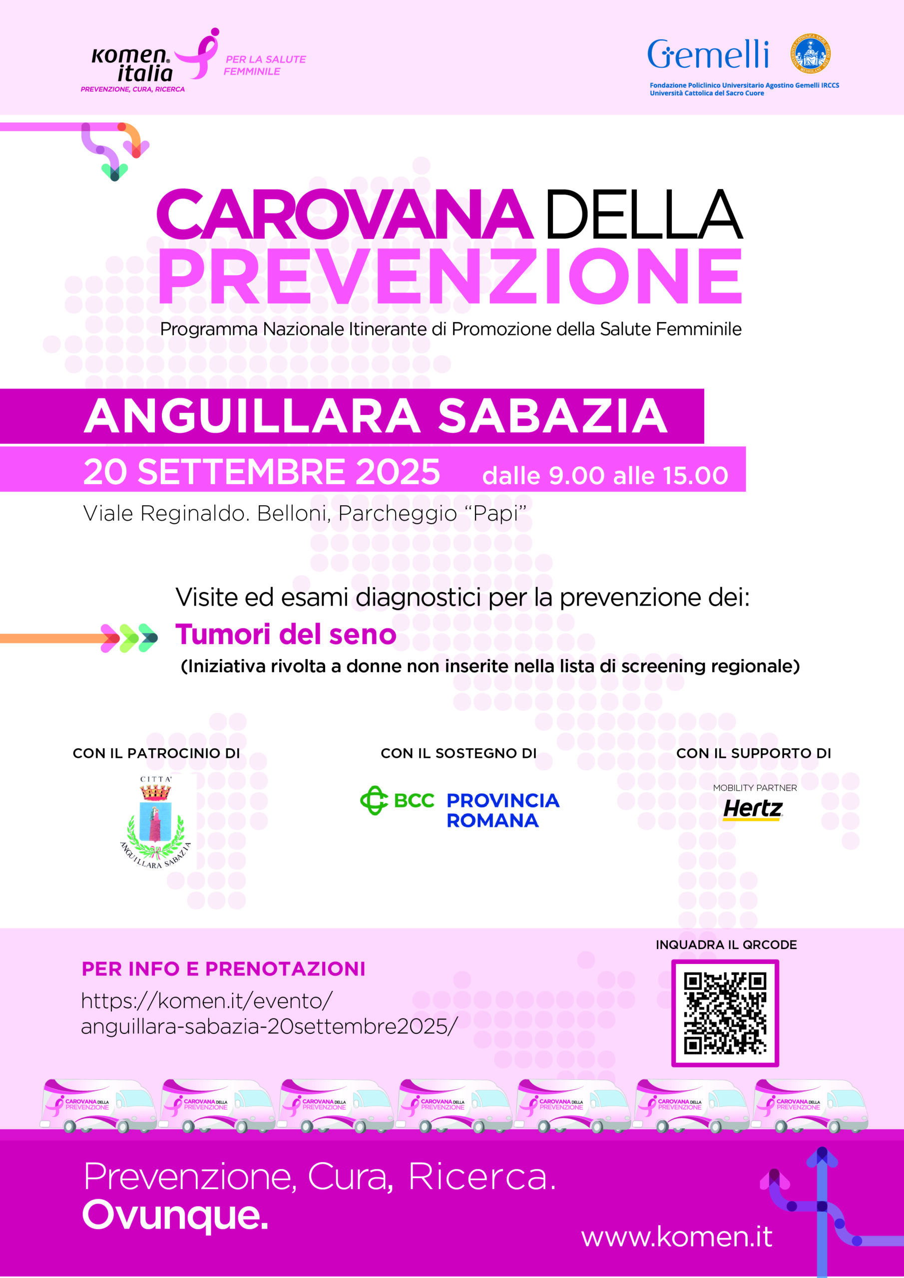 La Carovana della Prevenzione è il Programma Nazionale Itinerante di Promozione della Salute di Komen Italia che offre ad un pubblico sempre più ampio attività gratuite di sensibilizzazione e prevenzione delle principali patologie oncologiche di genere.