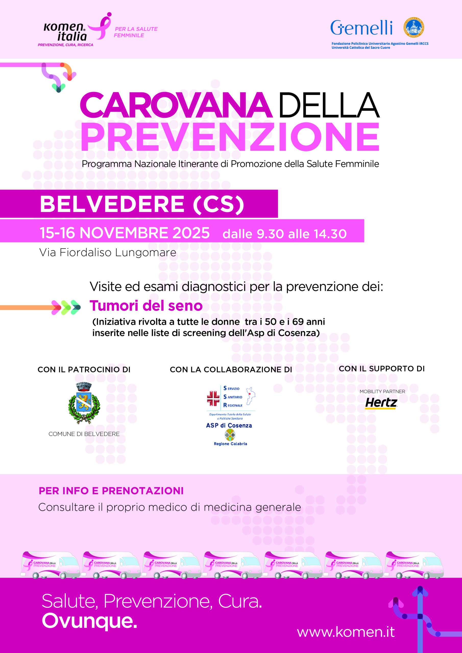 Komen Italia promuove il progetto Carovana della Prevenzione attraverso una giornata di promozione della salute con visite specialistiche per la prevenzione dei tumori del seno riservate alle donne fuori screening regionali.