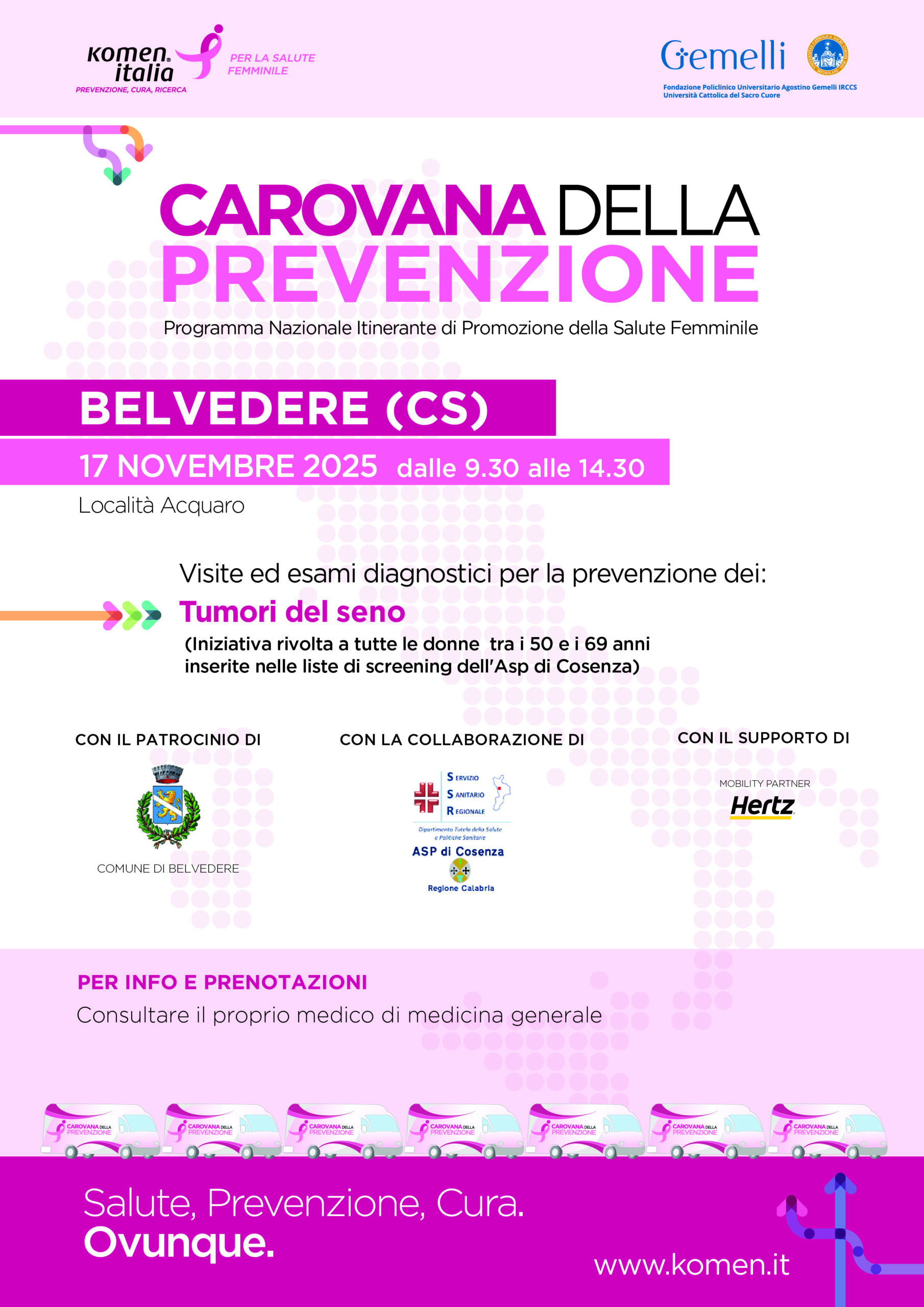 Komen Italia promuove il progetto Carovana della Prevenzione attraverso una giornata di promozione della salute con visite specialistiche per la prevenzione dei tumori del seno riservate alle donne fuori screening regionali.
