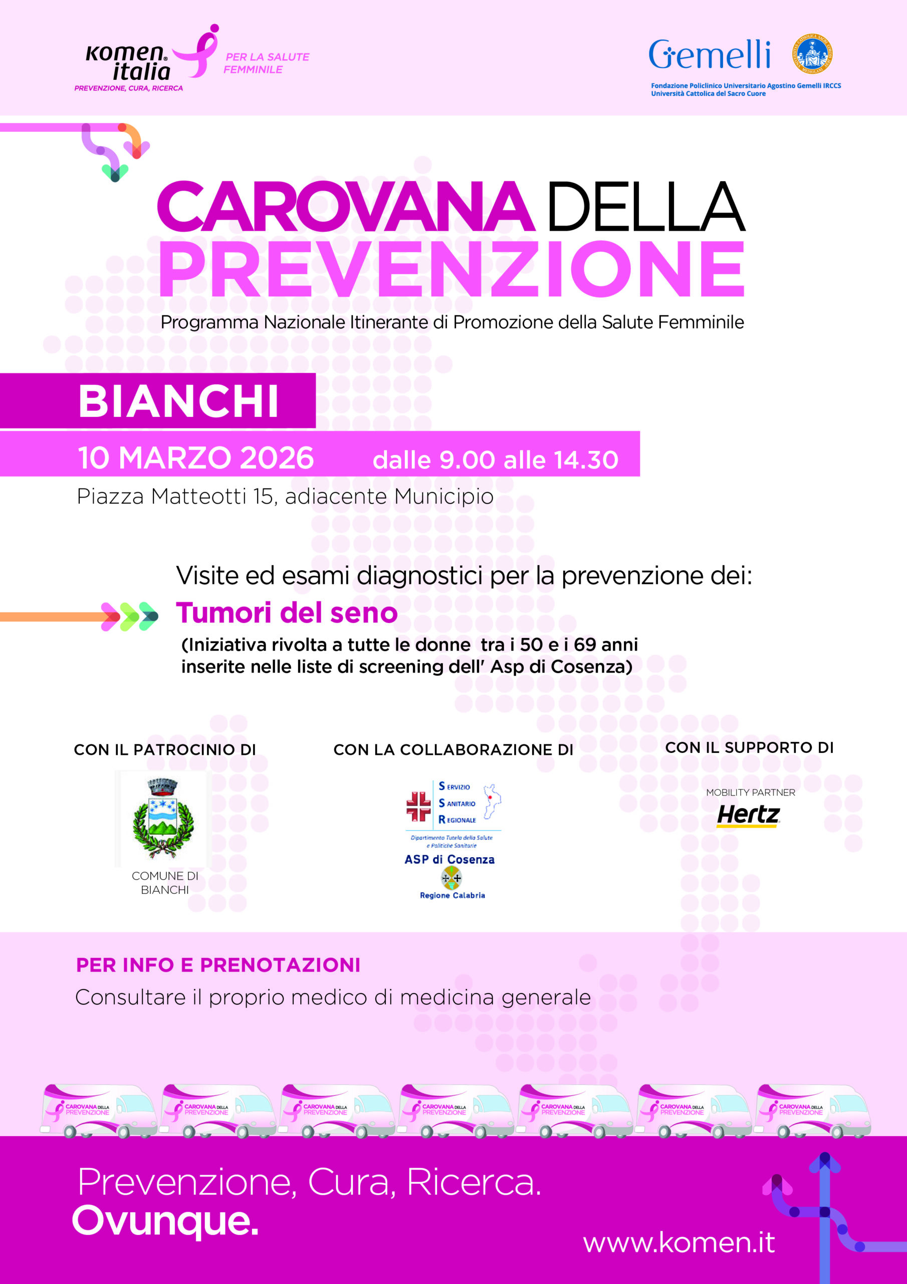 Komen Italia promuove il progetto Carovana della Prevenzione attraverso una giornata di promozione della salute con visite specialistiche per la prevenzione dei tumori del seno riservate alle donne fuori screening regionali.