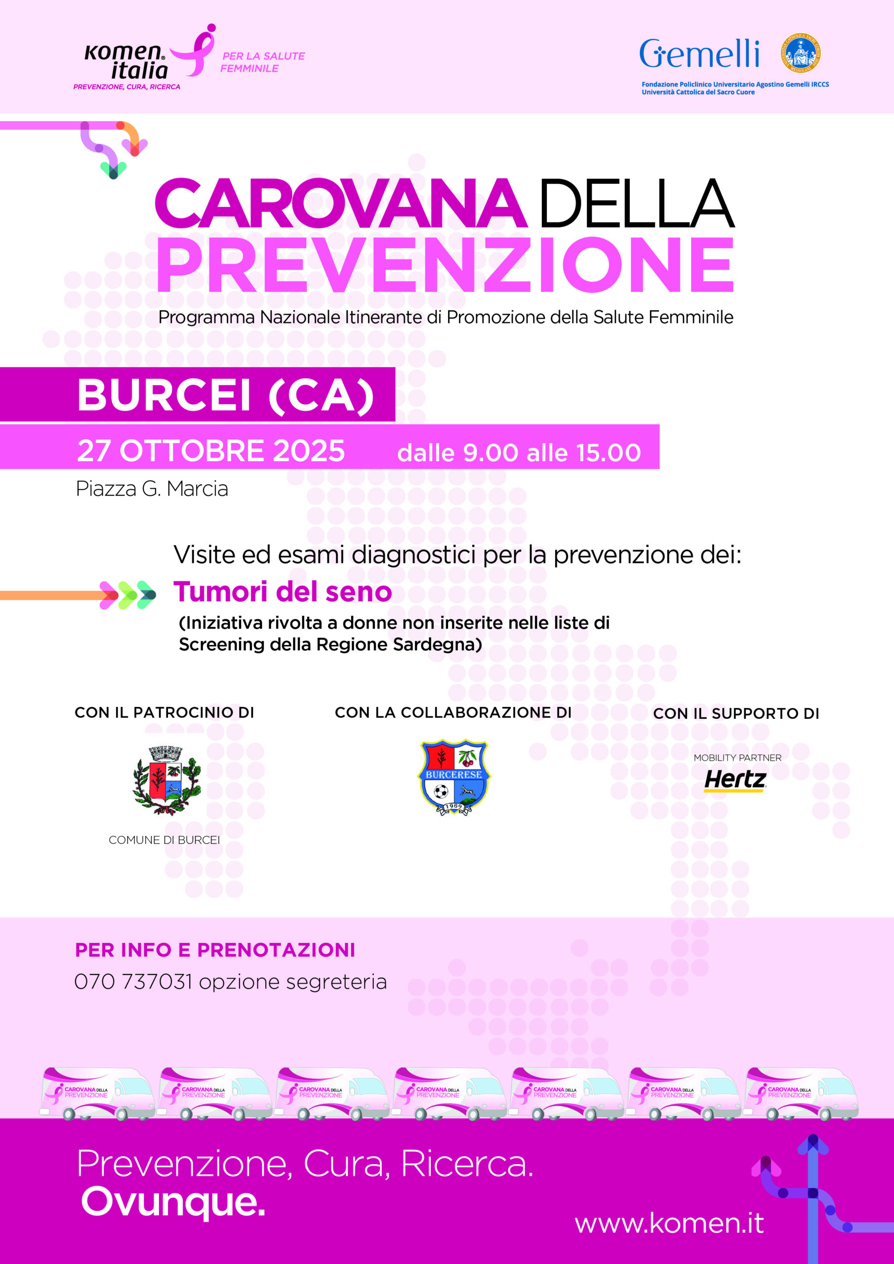 Komen Italia promuove il progetto Carovana della Prevenzione attraverso una giornata di promozione della salute con visite specialistiche per la prevenzione dei tumori del seno riservate alle donne fuori screening regionali.
