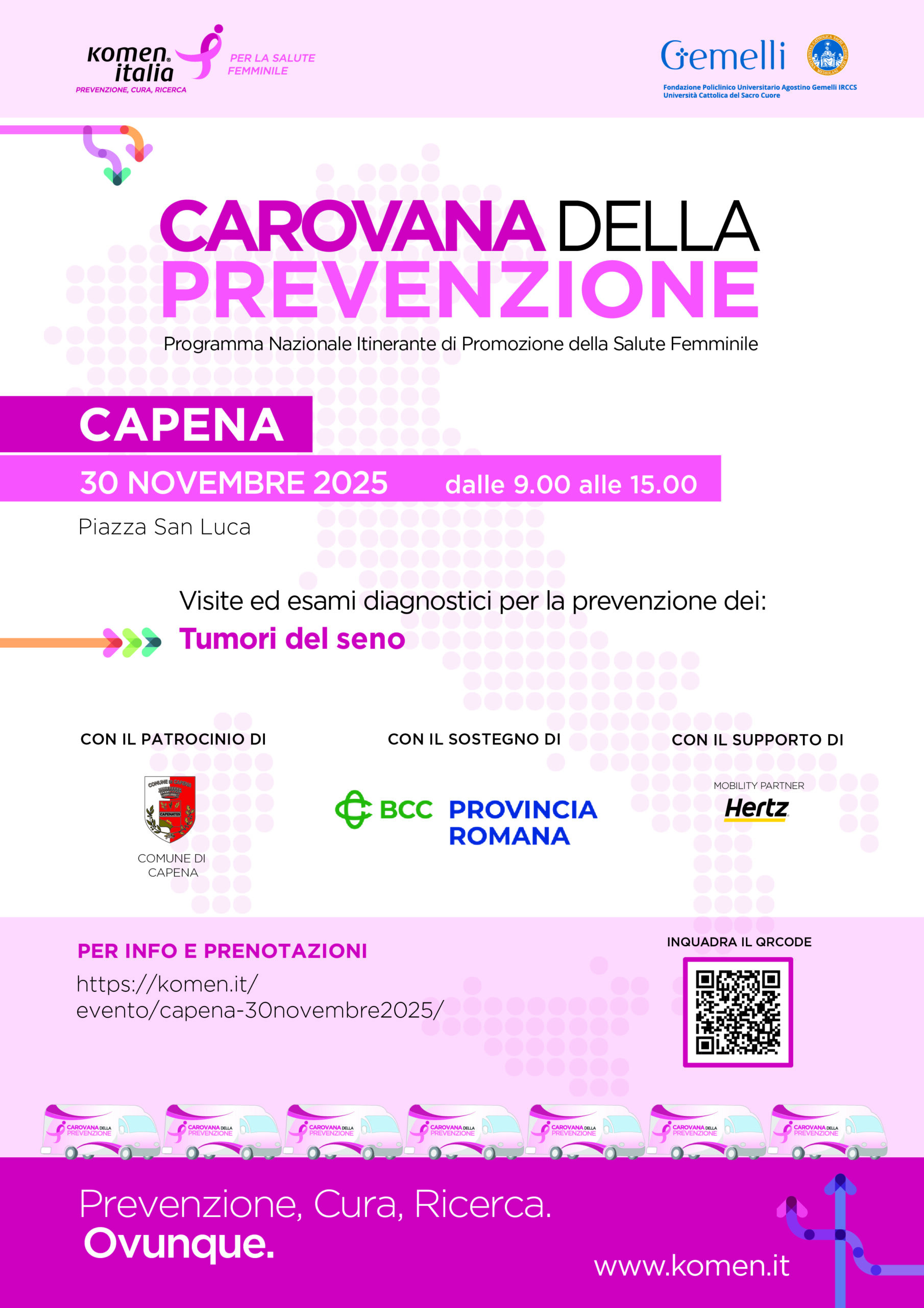 La Carovana della Prevenzione è il Programma Nazionale Itinerante di Promozione della Salute di Komen Italia che offre ad un pubblico sempre più ampio attività gratuite di sensibilizzazione e prevenzione delle principali patologie oncologiche di genere.
