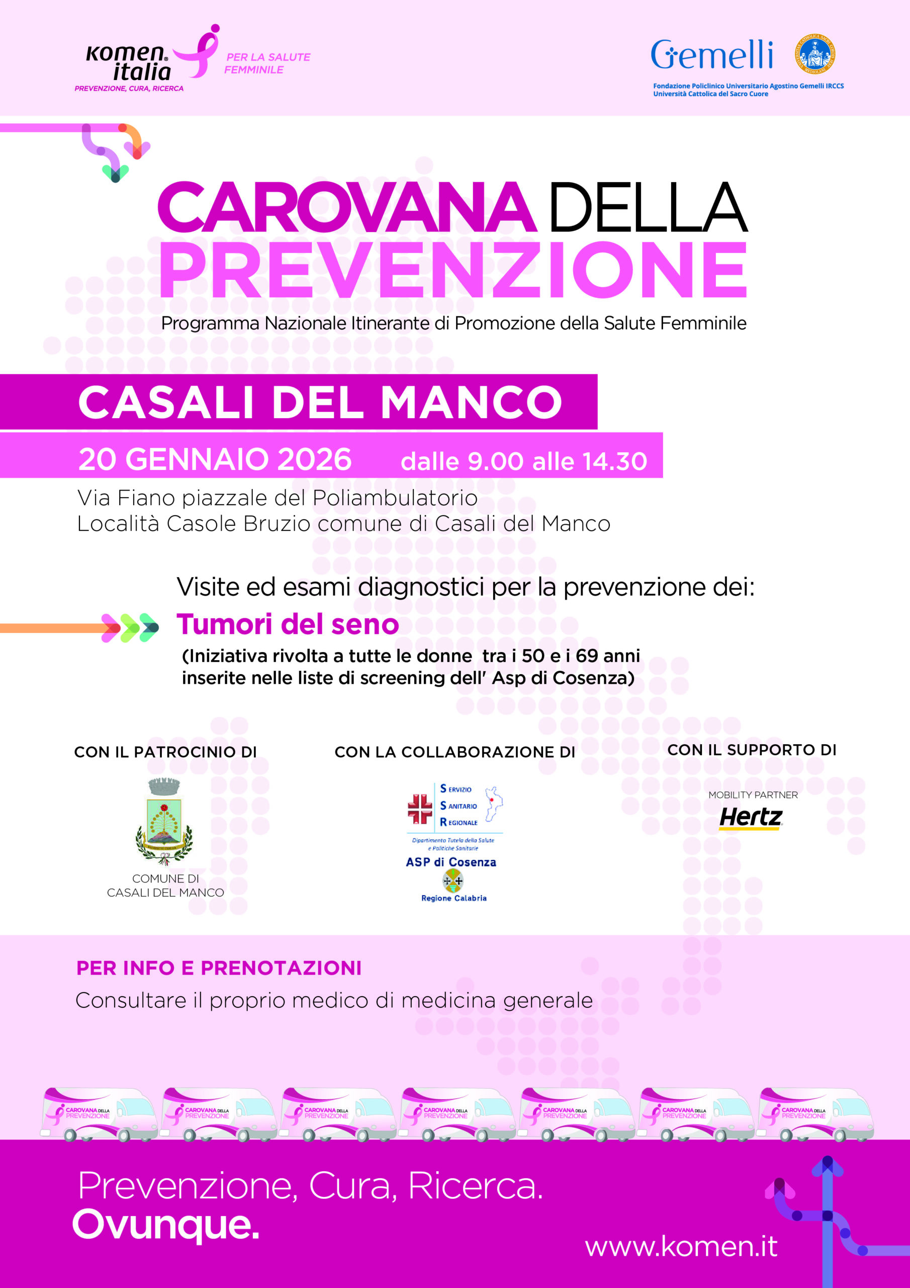 Komen Italia promuove il progetto Carovana della Prevenzione attraverso una giornata di promozione della salute con visite specialistiche per la prevenzione dei tumori del seno riservate alle donne fuori screening regionali.