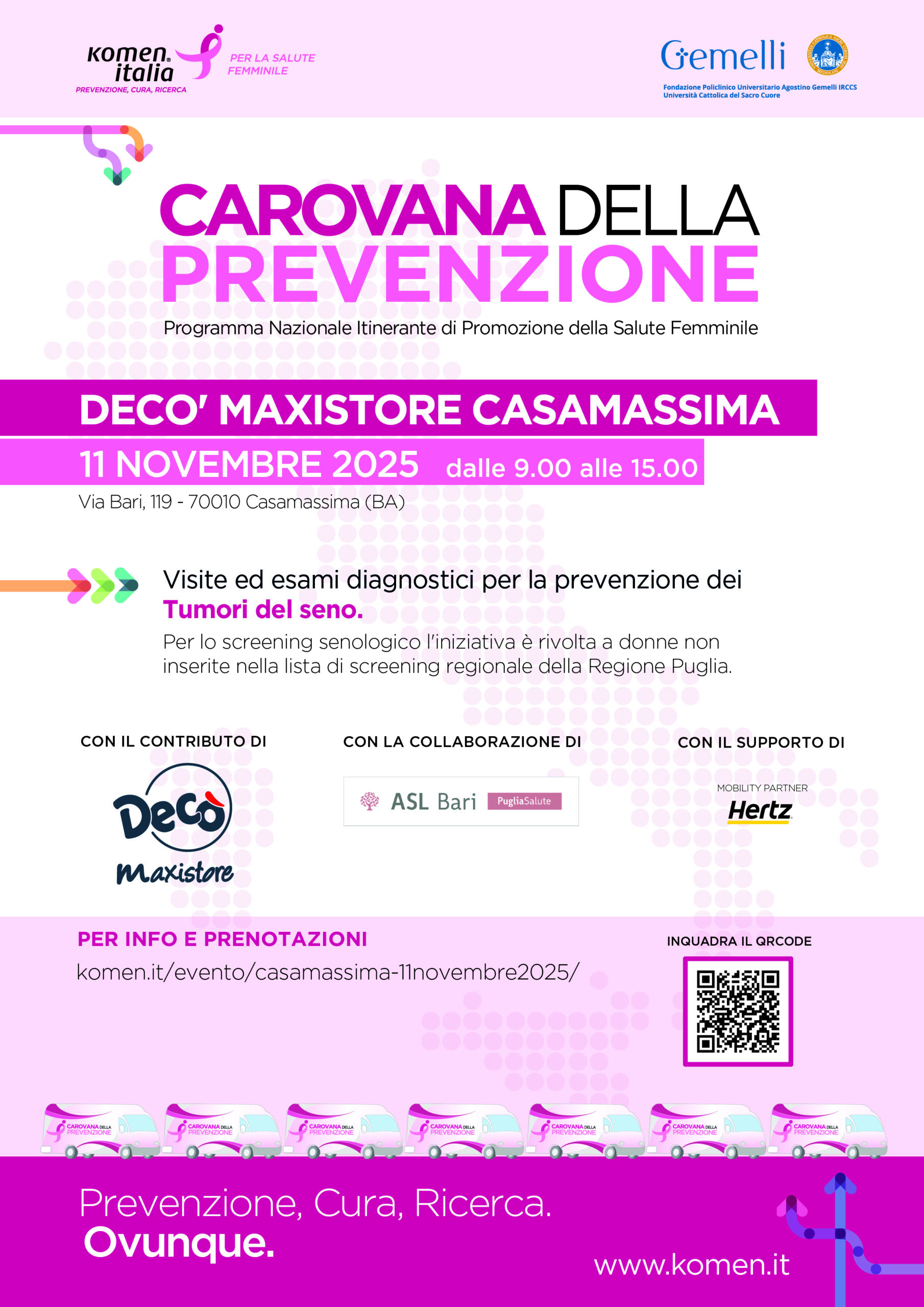La Carovana della Prevenzione è il Programma Nazionale Itinerante di Promozione della Salute di Komen Italia che offre ad un pubblico sempre più ampio attività gratuite di sensibilizzazione e prevenzione delle principali patologie oncologiche di genere.