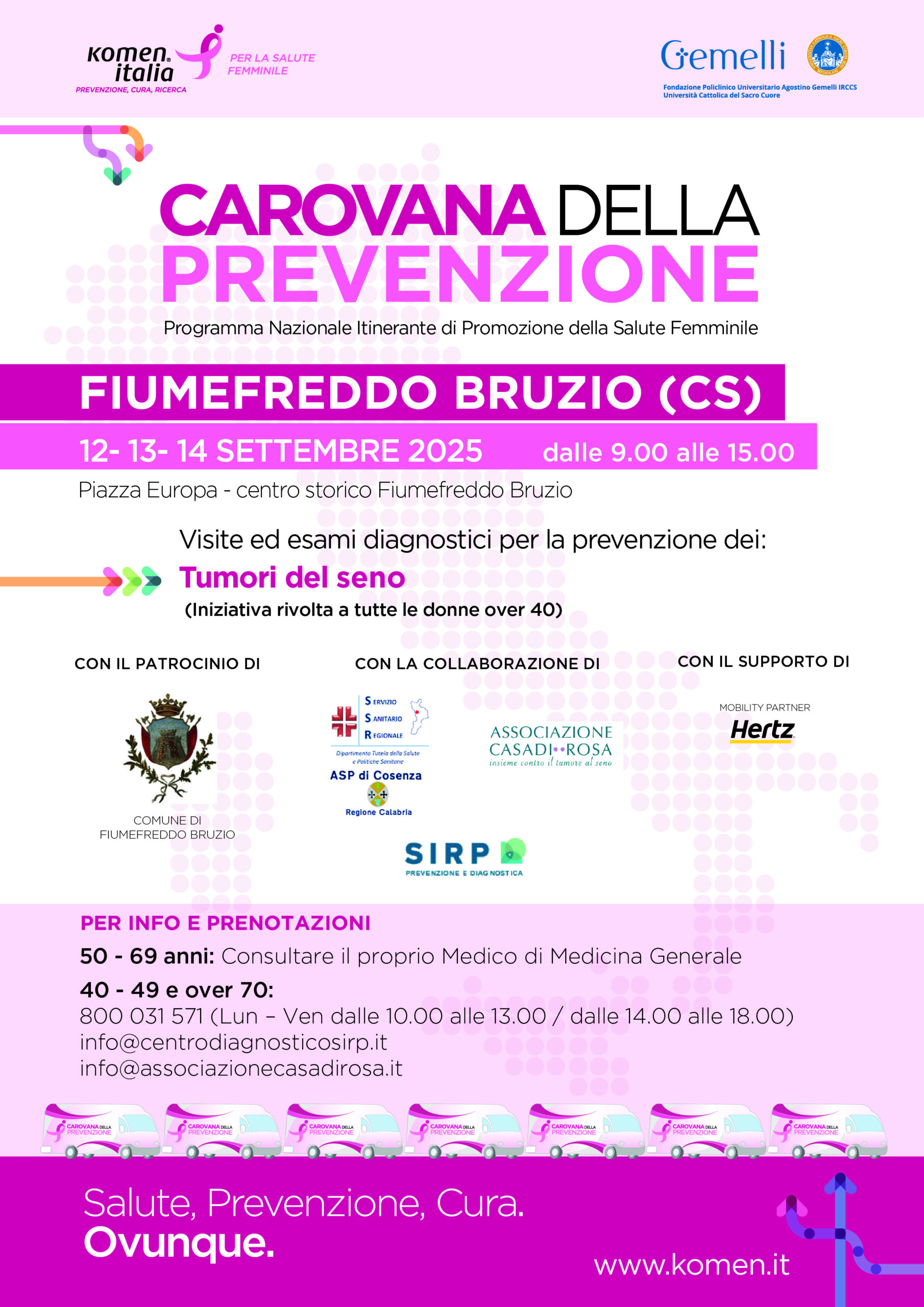 La Carovana della Prevenzione è il Programma Nazionale Itinerante di Promozione della Salute di Komen Italia che offre ad un pubblico sempre più ampio attività gratuite di sensibilizzazione e prevenzione delle principali patologie oncologiche di genere.