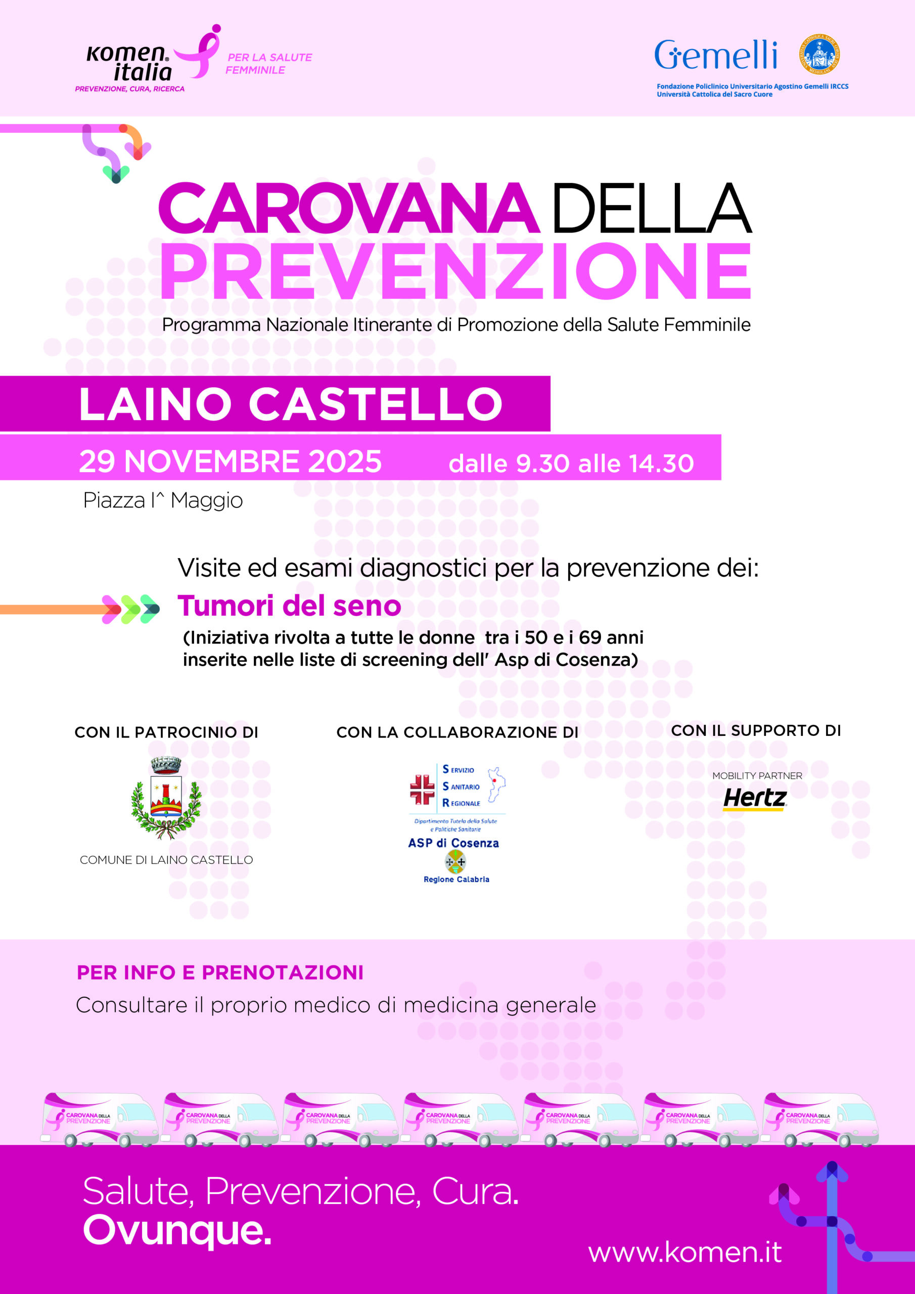 La Carovana della Prevenzione è il Programma Nazionale Itinerante di Promozione della Salute di Komen Italia che offre ad un pubblico sempre più ampio attività gratuite di sensibilizzazione e prevenzione delle principali patologie oncologiche di genere.