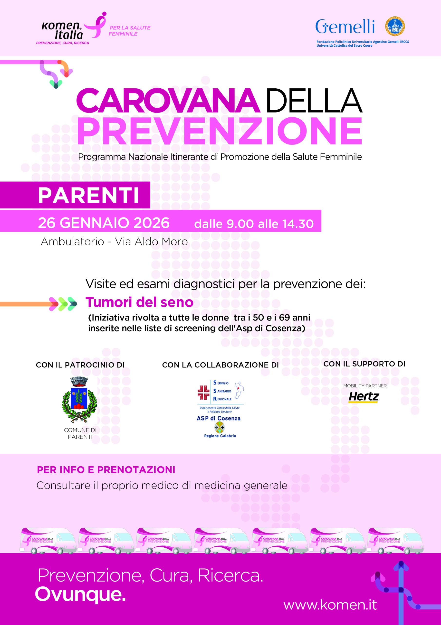 Komen Italia promuove il progetto Carovana della Prevenzione attraverso una giornata di promozione della salute con visite specialistiche per la prevenzione dei tumori del seno riservate alle donne fuori screening regionali.
