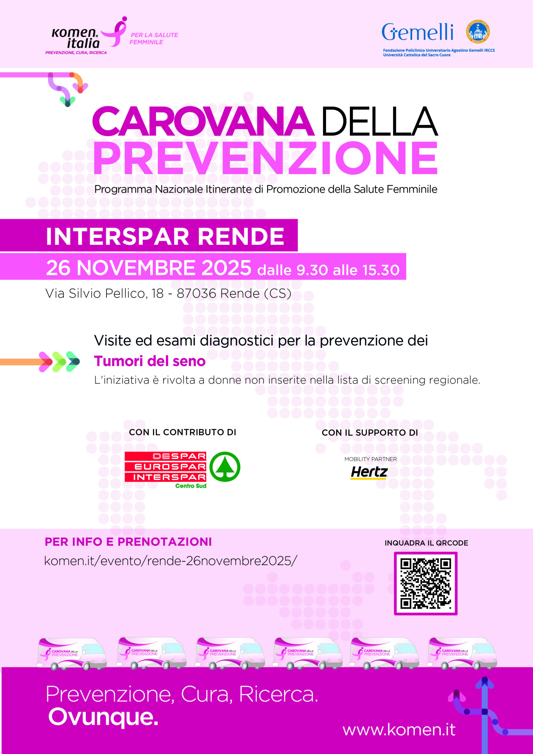La Carovana della Prevenzione è il Programma Nazionale Itinerante di Promozione della Salute di Komen Italia che offre ad un pubblico sempre più ampio attività gratuite di sensibilizzazione e prevenzione delle principali patologie oncologiche di genere.