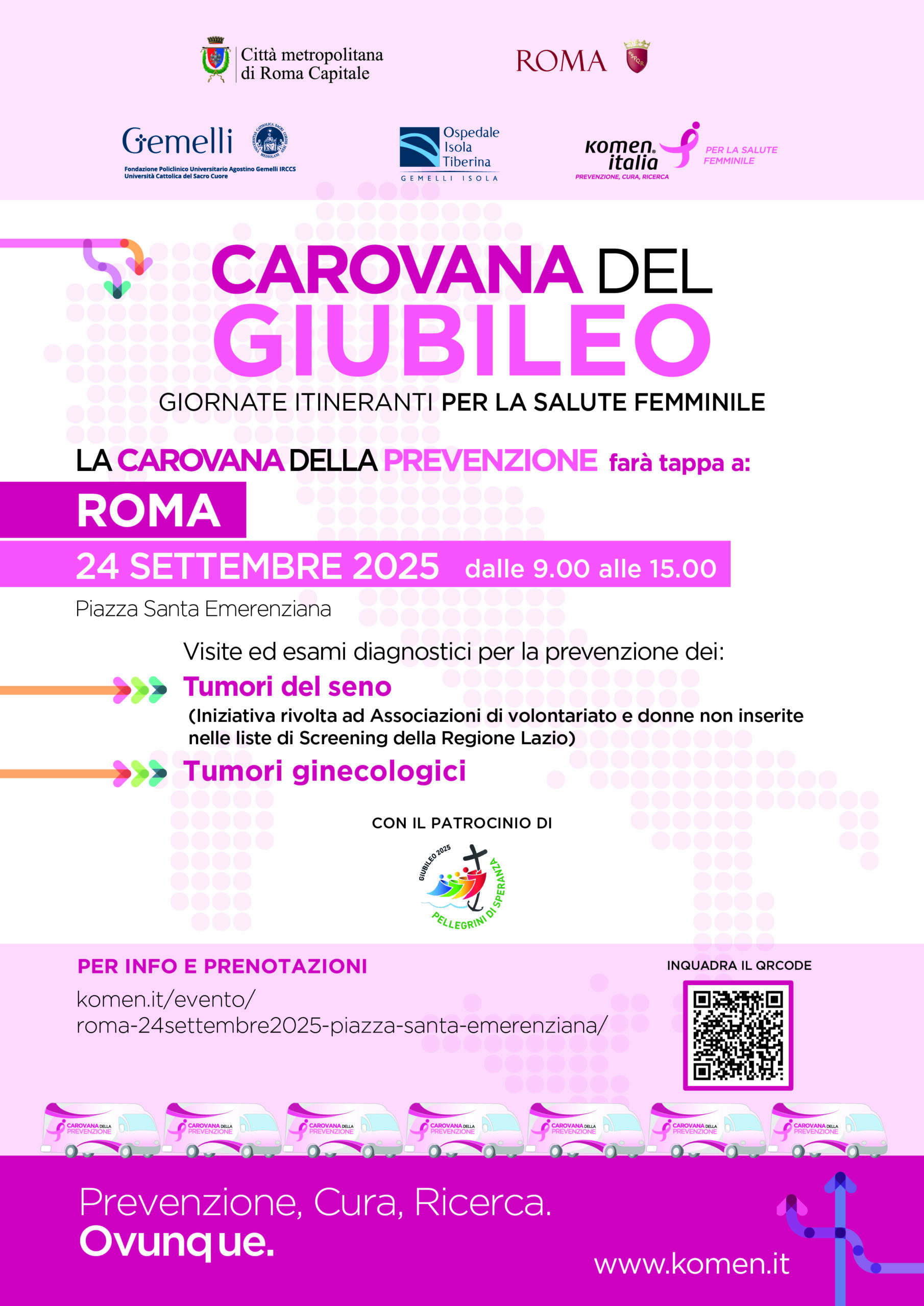 Il Comune di Roma e cmRc con il patrocinio del Dicastero dell’Evangelizzazione per il Giubileo 2025, sostengono il progetto Carovana della Prevenzione e offre una giornata di promozione della salute con visite specialistiche per la prevenzione dei tumori del seno riservate alle donne fuori screening regionali (mammografia per donne fra i 40 e i 49 anni e over 74 e ecografia senologica under 40). Visite ginecologiche.