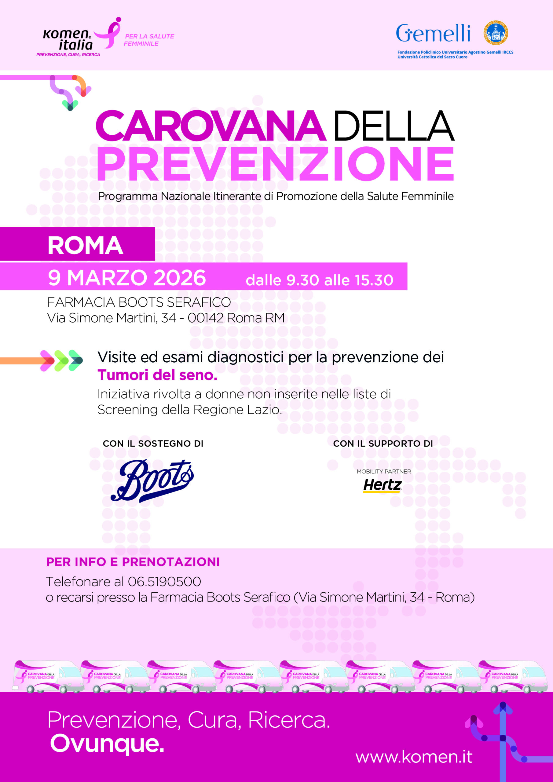 Komen Italia con il progetto Carovana della Prevenzione organizza una giornata di promozione della salute con visite specialistiche per la prevenzione dei tumori del seno.