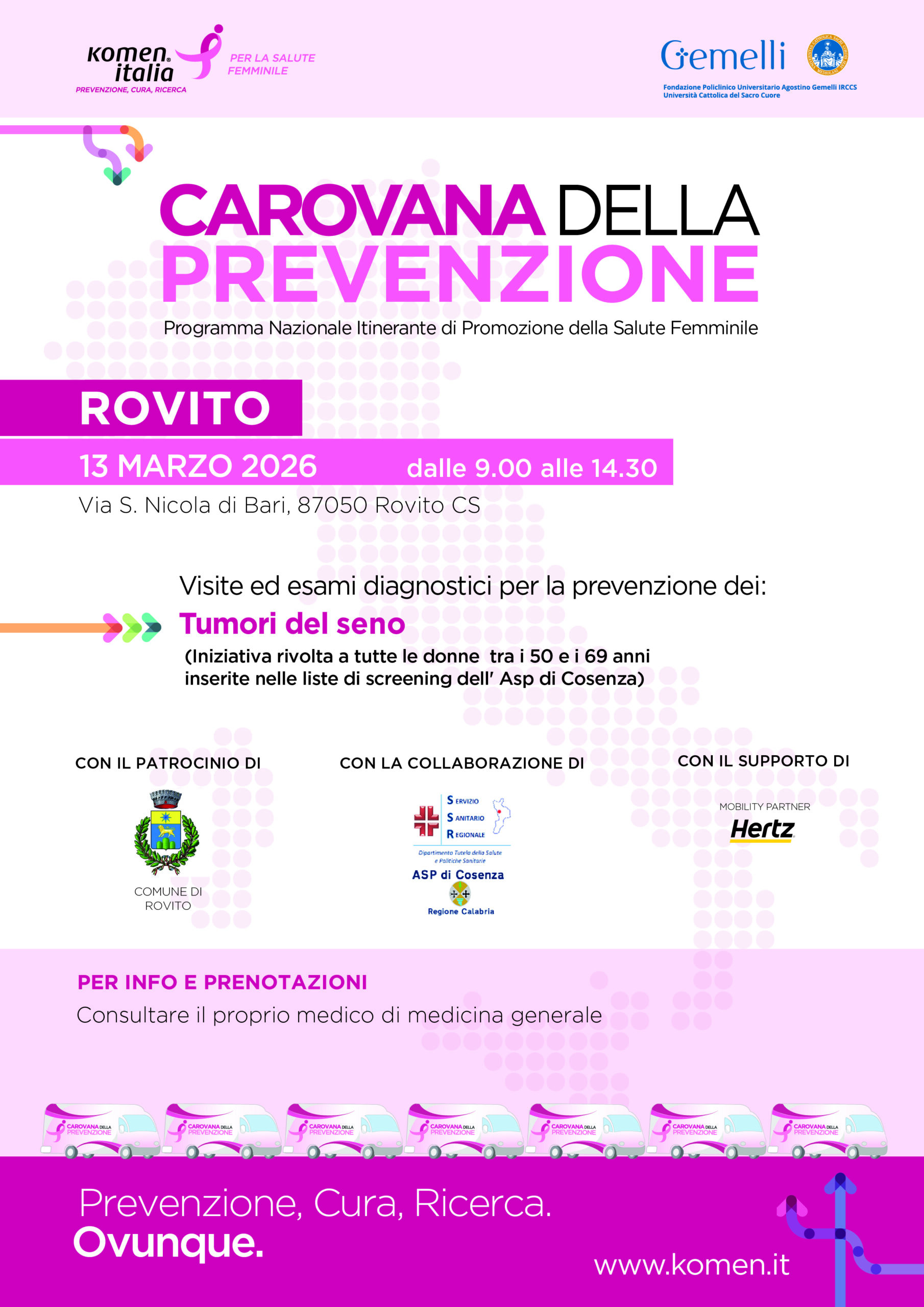 Komen Italia promuove il progetto Carovana della Prevenzione attraverso una giornata di promozione della salute con visite specialistiche per la prevenzione dei tumori del seno riservate alle donne fuori screening regionali.