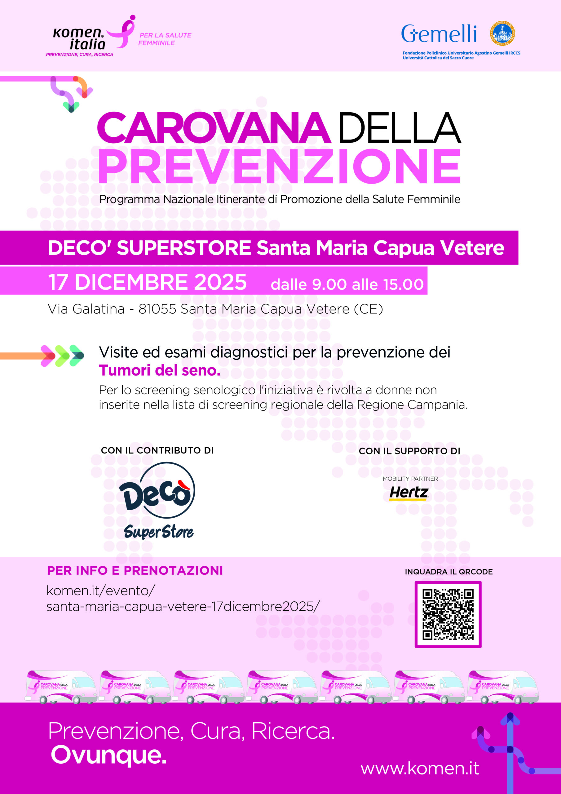 La Carovana della Prevenzione è il Programma Nazionale Itinerante di Promozione della Salute di Komen Italia che offre ad un pubblico sempre più ampio attività gratuite di sensibilizzazione e prevenzione delle principali patologie oncologiche di genere.