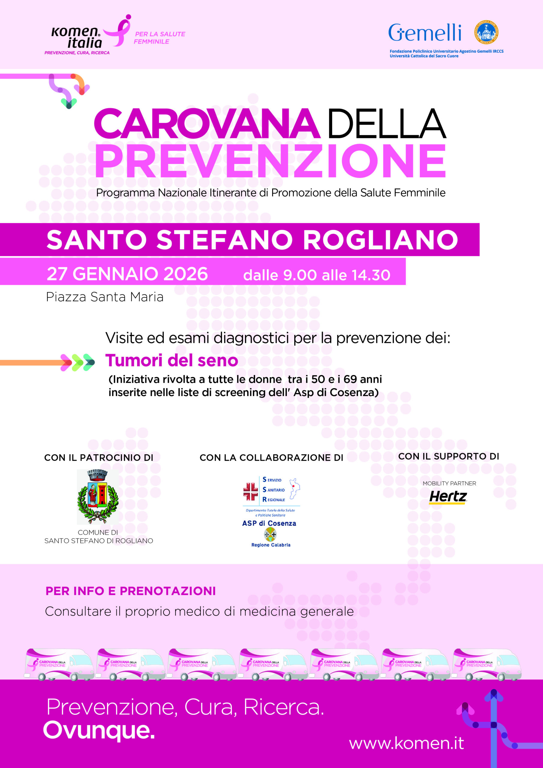 Komen Italia promuove il progetto Carovana della Prevenzione attraverso una giornata di promozione della salute con visite specialistiche per la prevenzione dei tumori del seno riservate alle donne fuori screening regionali.