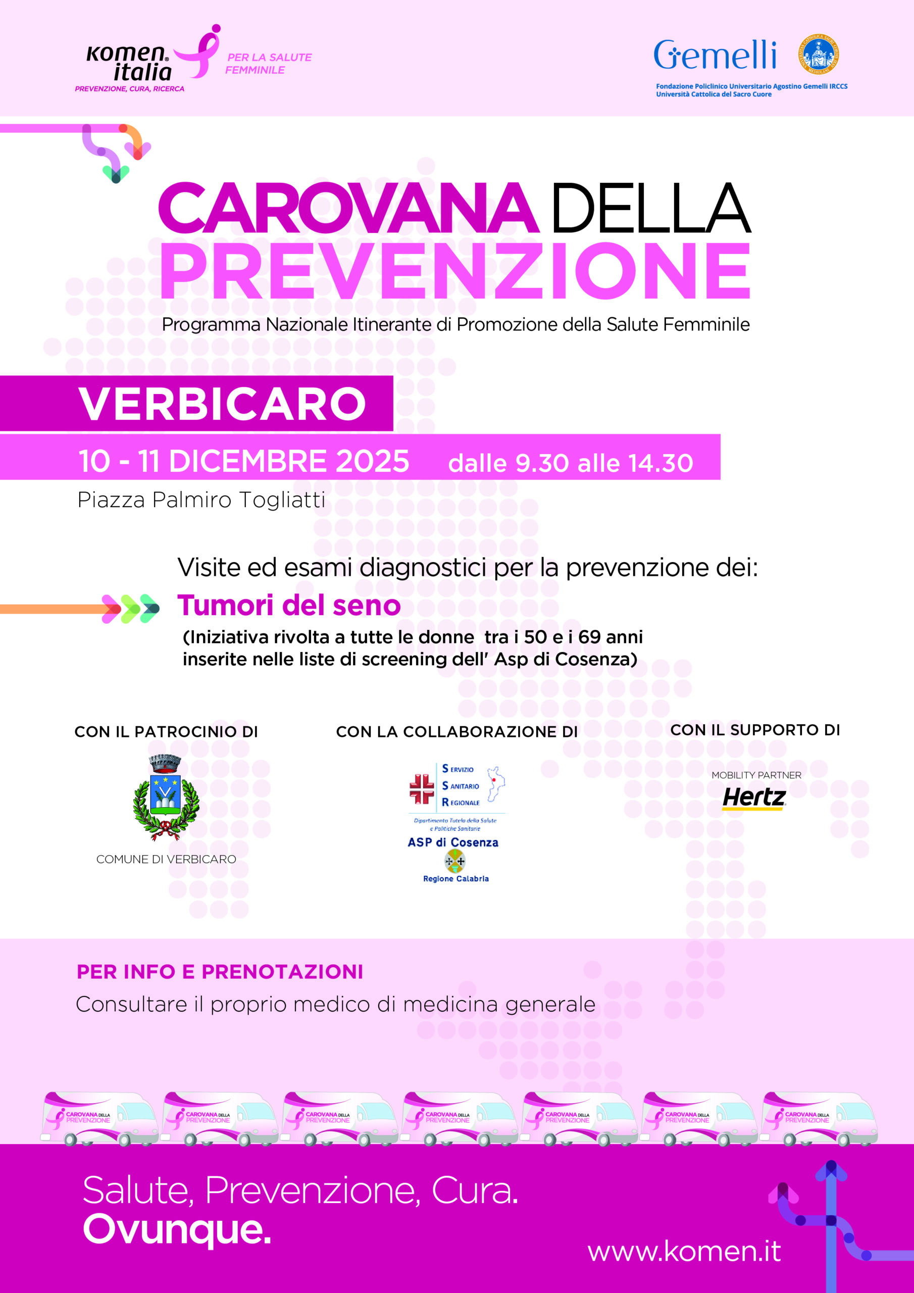Komen Italia promuove il progetto Carovana della Prevenzione attraverso una giornata di promozione della salute con visite specialistiche per la prevenzione dei tumori del seno riservate alle donne fuori screening regionali.