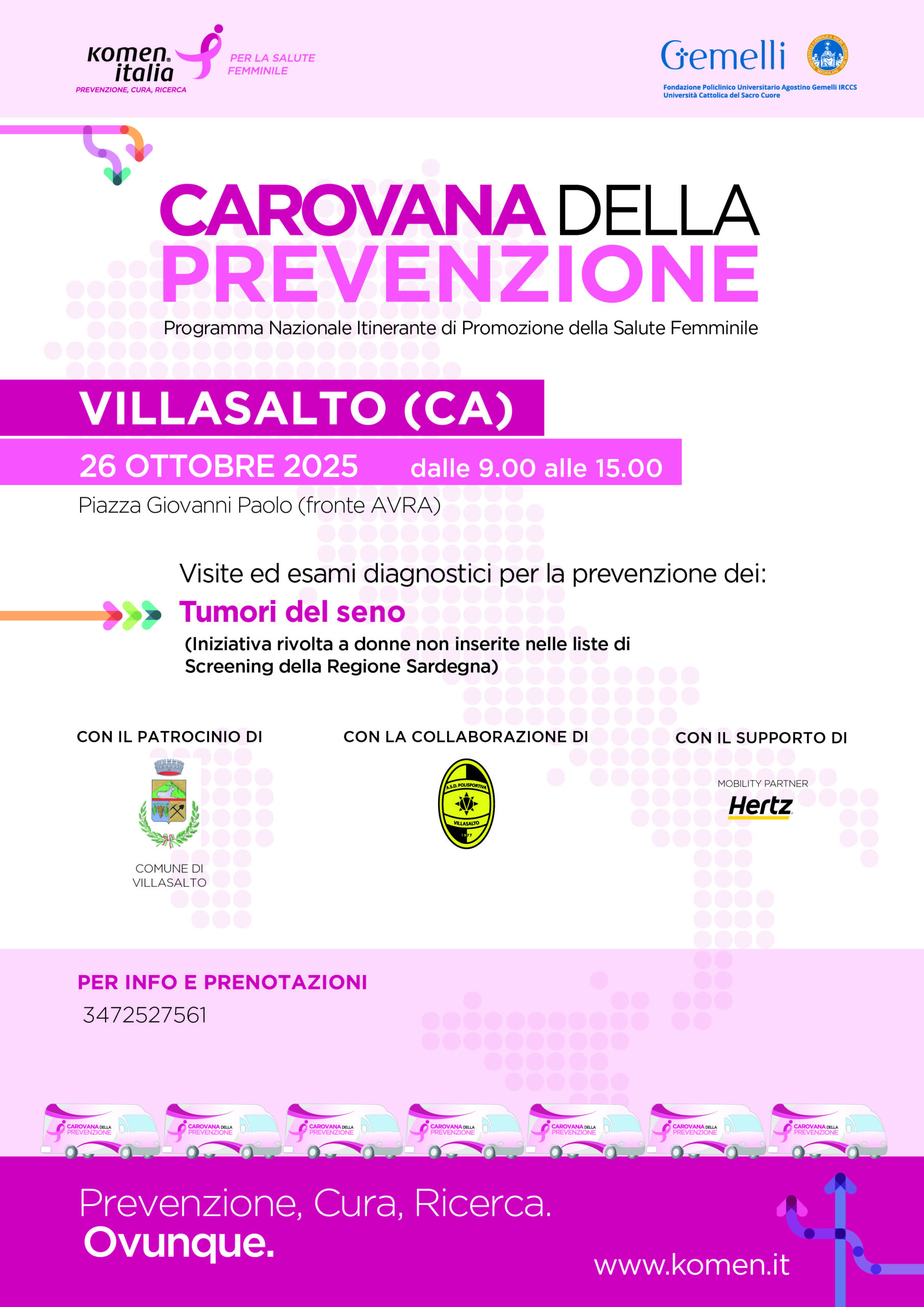 Komen Italia promuove il progetto Carovana della Prevenzione attraverso una giornata di promozione della salute con visite specialistiche per la prevenzione dei tumori del seno riservate alle donne fuori screening regionali.
