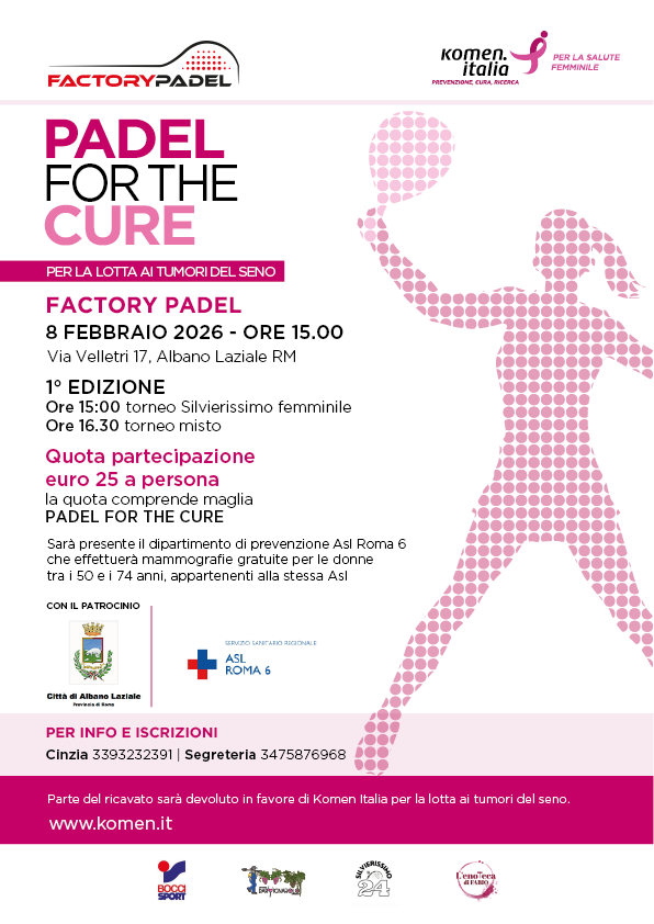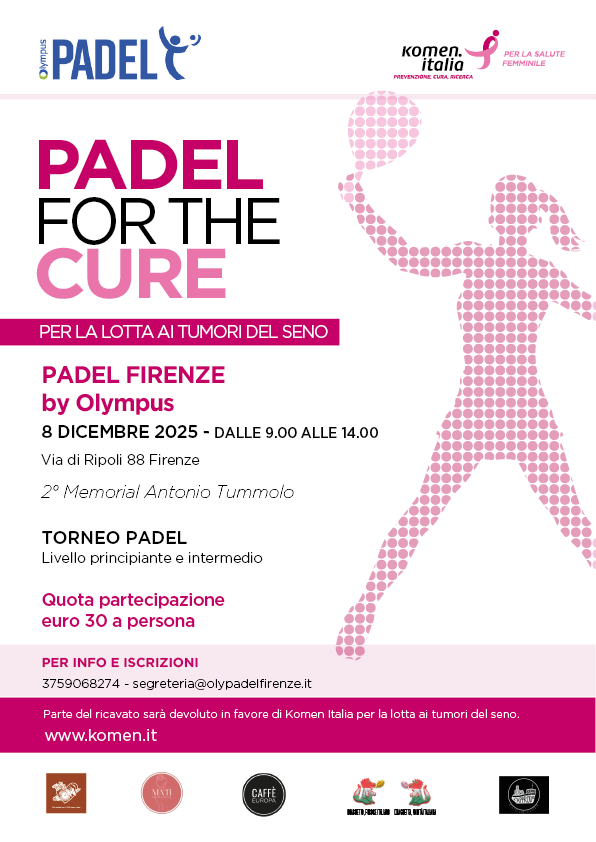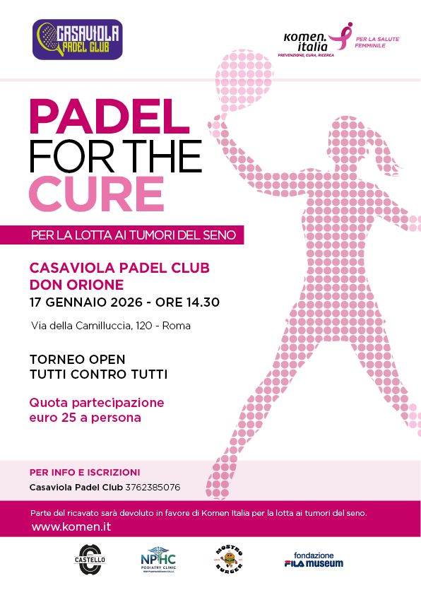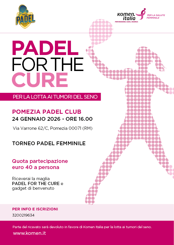 Con il Padel for the Cure prosegue l’impegno di Komen Italia a favore dello sport e del benessere con uno sguardo anche alla solidarietà, programma a cui stanno già aderendo altri tornei in tutta Italia. Il nuovo format Padel for the Cure può essere promosso da associazioni, circoli sportivi, aziende, volontari, Donne in Rosa, parenti e amici, followers, semplicemente organizzando una o più gare e seguendo le modalità indicate dalla Komen Italia.