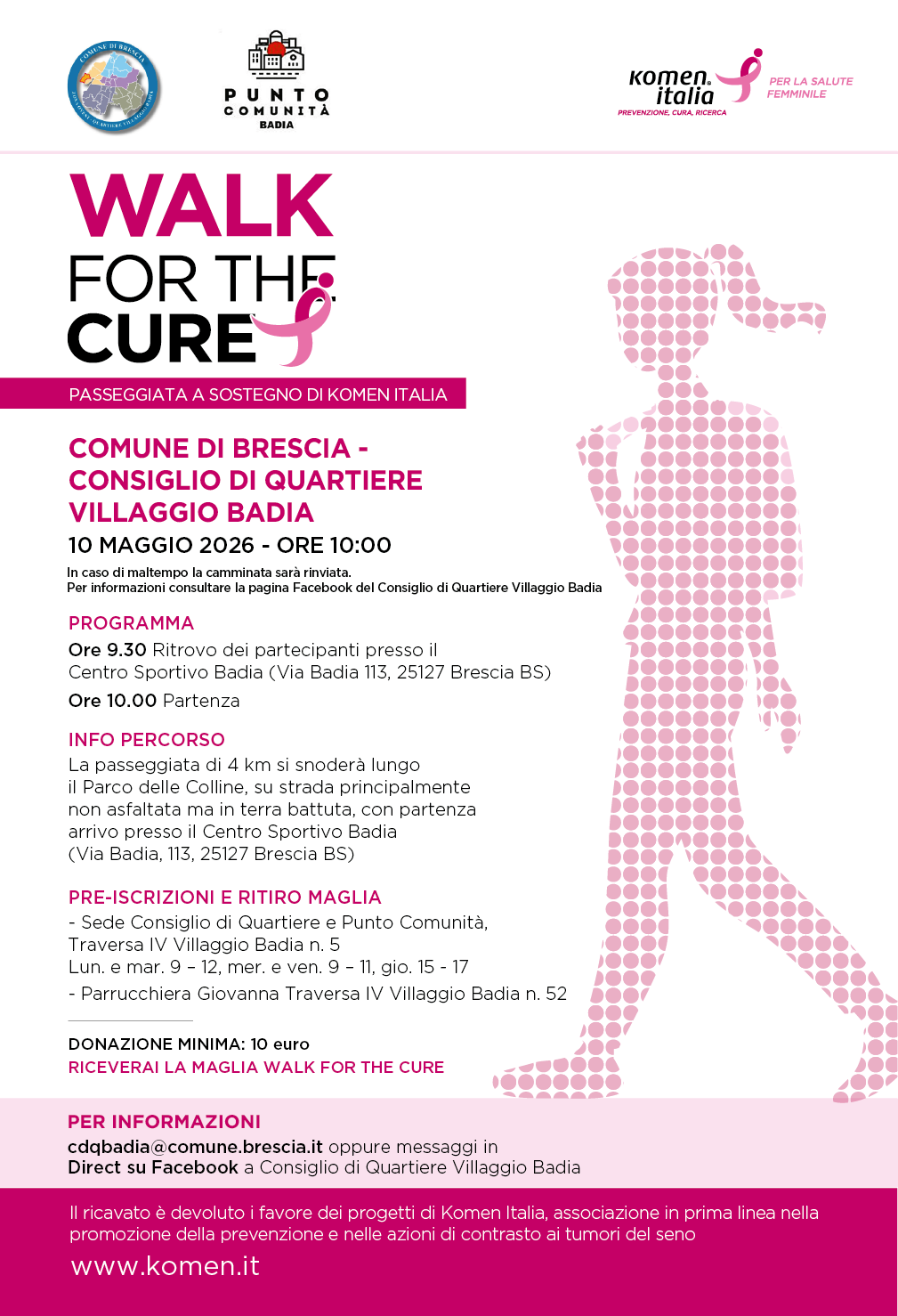 Komen Italia fornirà il materiale dedicato e la MAGLIA WALK per tutti i partecipanti e se vorrai potrai anche personalizzarla con la grafica del tuo evento e del tuo territorio.