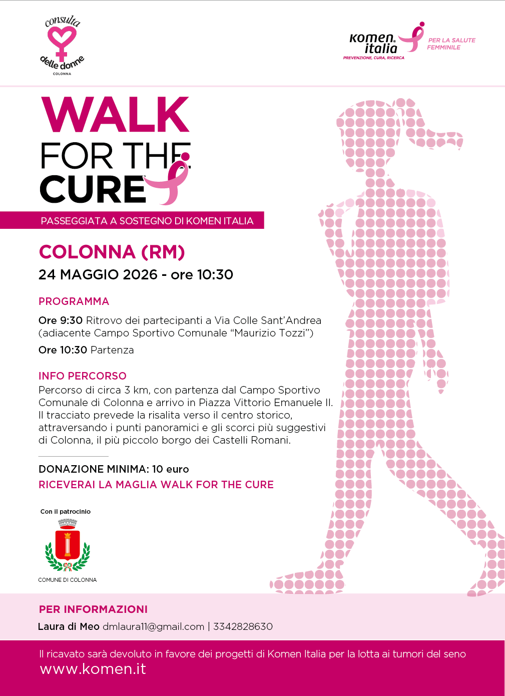 Komen Italia fornirà il materiale dedicato, la MAGLIA WALK per tutti i partecipanti e per le Donne in Rosa.